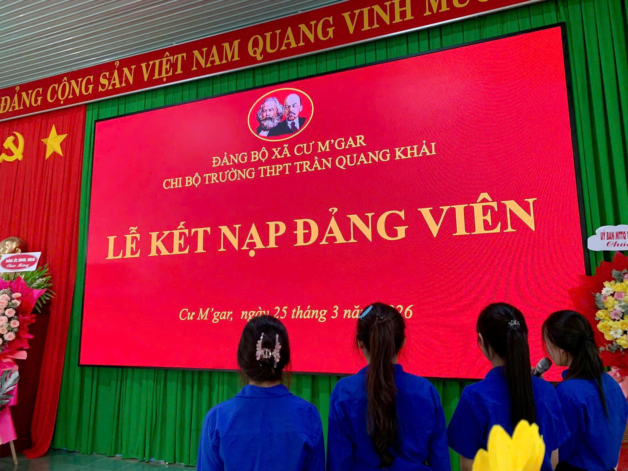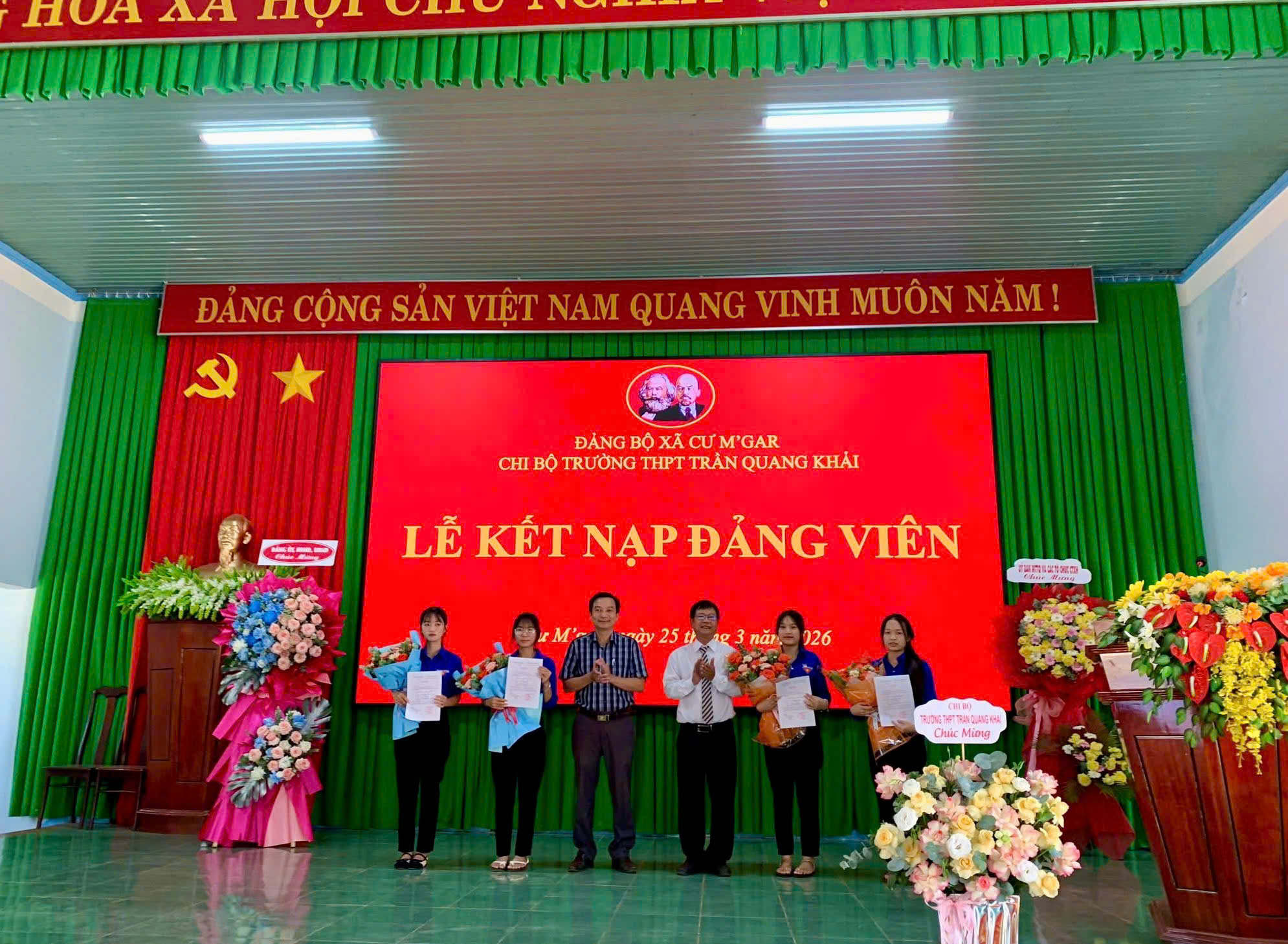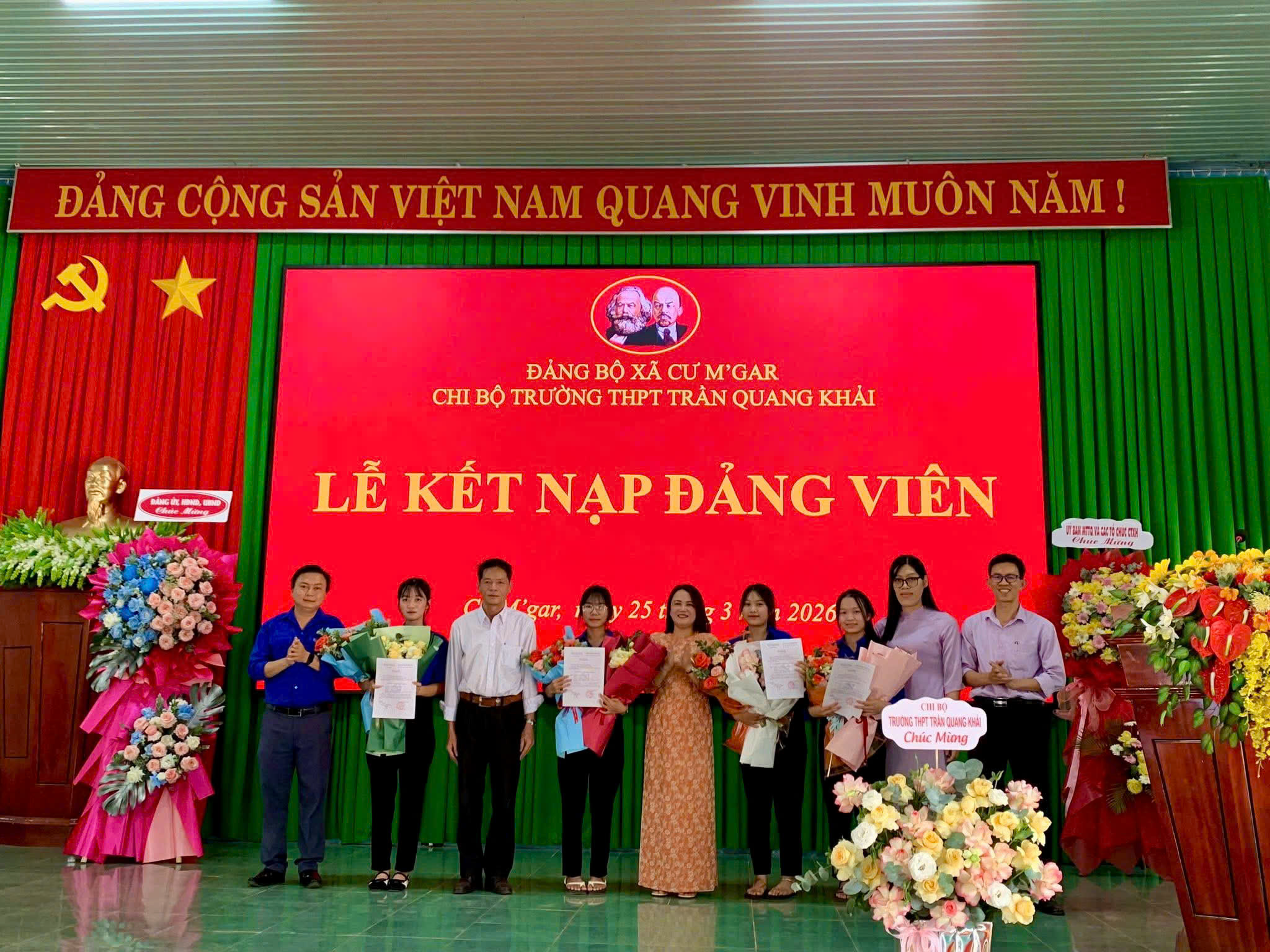 Hòa chung không khí thi đua sôi nổi của tuổi trẻ cả nước hướng tới kỷ niệm 95 năm ngày thành lập Đoàn Thanh niên Cộng sản Hồ Chí Minh (26/3/1931 – 26/3/2026). Chiều ngày 25/3/2026, tại Hội trường Đảng bộ xã Cư M’gar, Chi bộ Trường THPT Trần Quang Khải đã long trọng tổ chức Lễ kết nạp Đảng viên cho 04 đoàn viên ưu tú là học sinh của nhà trường.